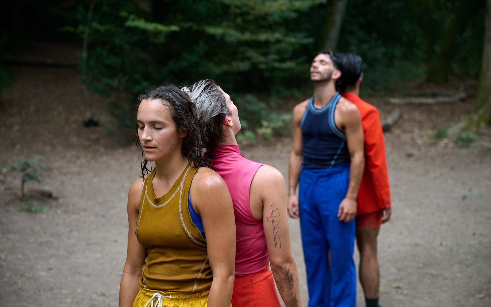 Rave, Flashmob oder Fitnessübung? In «Faking It» ist alles möglich. Vier Performer·innen wechseln ständig ihre Rollen – mal verspielt, mal athletisch, mal sinnlich. Motive des Urban Dance treffen auf ekstatische Trancezustände; Fitnessübungen verwandeln sich in Fruchtbarkeitsrituale. Ganz nach dem Motto, «Fake it ’til you make it» täuschen sie an und erfinden sich im nächsten Moment neu. Getrieben vom hypnotischen Beat des Schlagzeugers Julian Sartorius verlieren sich die Körper im Rhythmus und finden darin immer neue Formen des Gemeinsamseins. Ob Waldboden, Asphalt oder Festivaltrubel – überall wird getanzt. Ein wahnwitziges Bootcamp-Rave-Mash-up, das sich der ursprünglichsten aller Bewegungen widmet: dem Tanzen zum Beat.