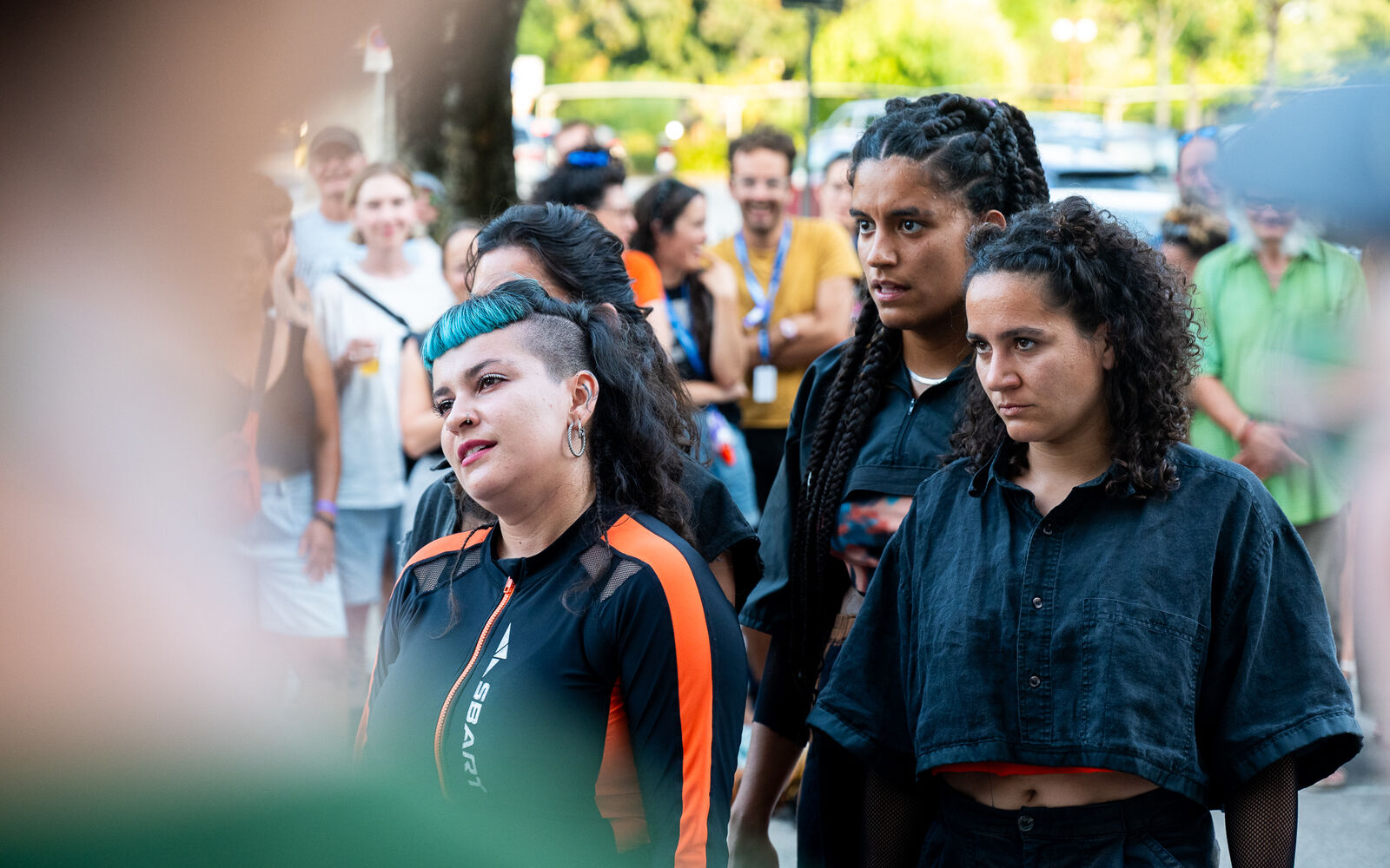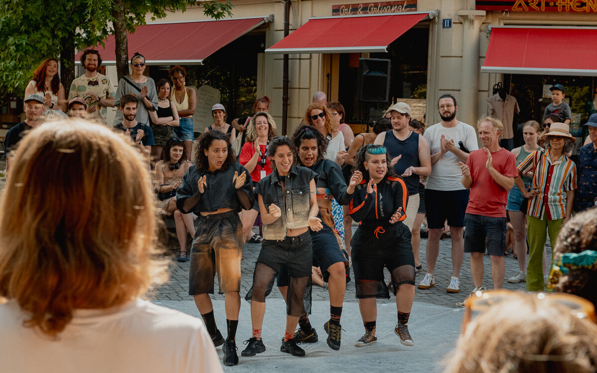 Eine «Gang of chicks»* taucht auf und lädt das Publikum ein, ihrem Rhythmus zu folgen… (oder auch nicht). Frech, schnell und unnachgiebig ziehen die Performer·innen die Blicke auf sich und fordern heraus. Zwischen Tanz, Akrobatik und physischem Theater erobern sie den Raum mit provokanter Energie und Witz. Angetrieben von Wut streben sie nach kollektiver Stärke. «parade d’intimidation aigre-douce» fordert dazu auf, Ungerechtigkeiten nicht länger hinzunehmen und Gewalt an Körpern, die als weiblich* und/oder rassifiziert wahrgenommen werden, zu hinterfragen. See you on the bubble wrap!